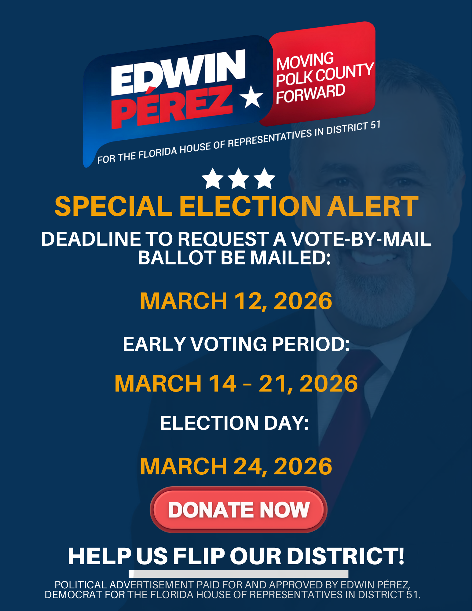 Edwin is a Haines City resident and community leader who has spent years listening to neighbors, supporting local efforts, and working to make northern Polk County a better place to live, work, and raise a family.